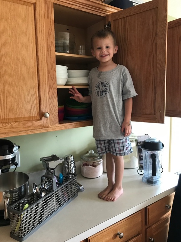 Here is a helpful son, doing service for his mama and helping unload the dishwasher while wearing his favorite shirt!