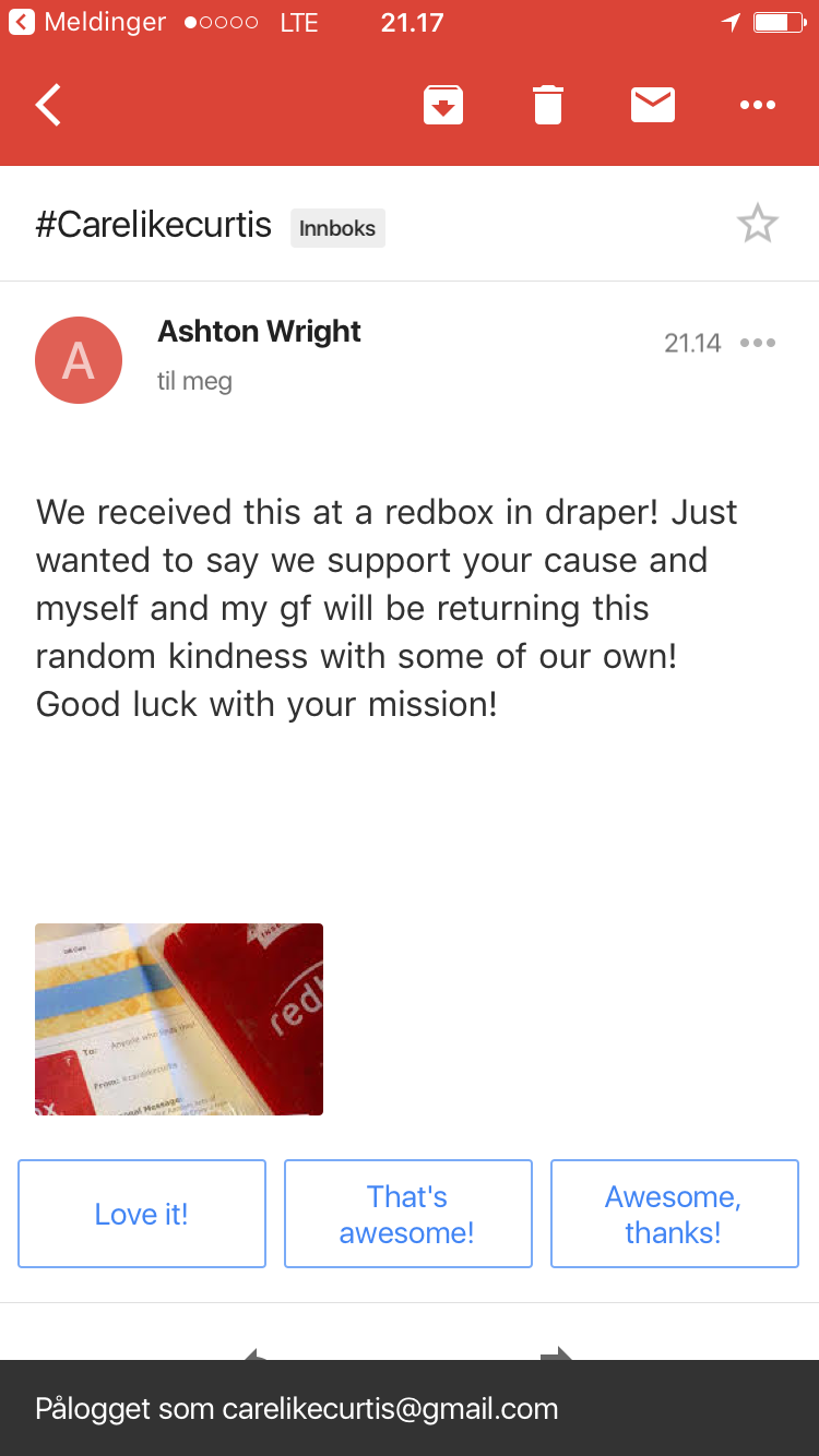 A few days ago, we got an email from Ashton W. who wrote, "We received this at a redbox in draper! Just wanted to say we support your cause and myself and my gf will be returning this random kindness with some of our own! Good luck with your mission!" It is exciting to hear from those on the other end and we are thrilled that Ashton and his girlfriend will be joining our cause!