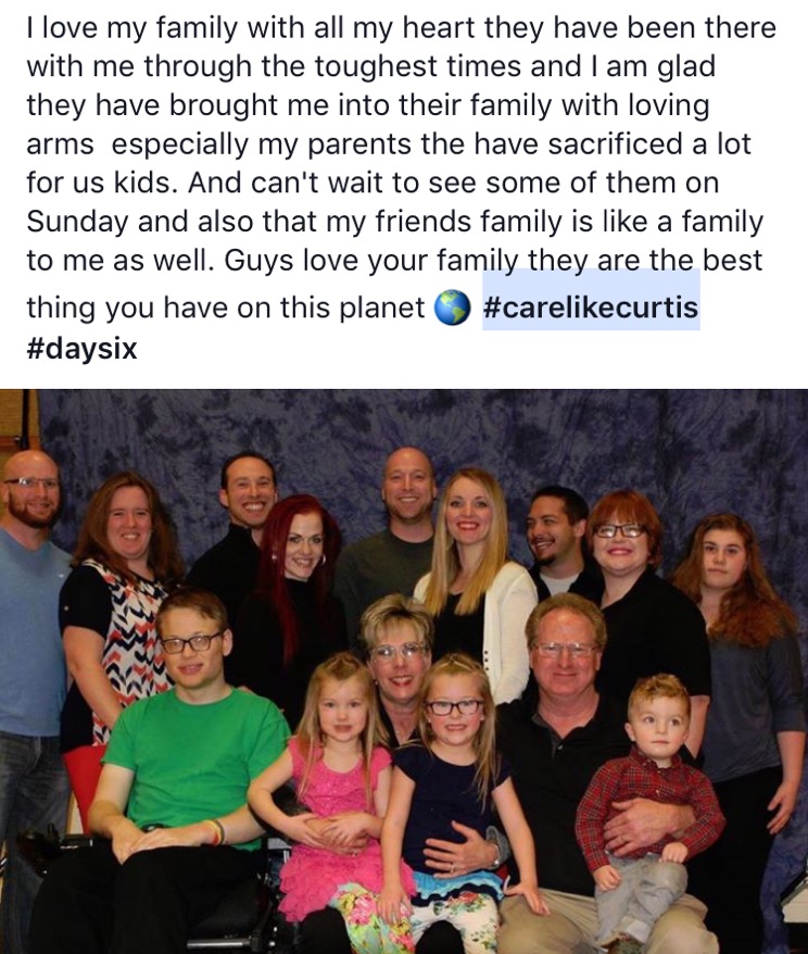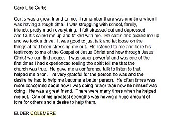 Curtis was not perfect, and like most of us experienced his own dark days. However, he used those moments to better empathize with others. Curtis was sensitive to the needs of those around them. If he was in a group and found an individual who didn't want to participate, he would sit with them for hours and talk. He often sent texts, made phone calls, and wrote letters to those he cared for. He believed in everyone, and with that belief others were lifted.